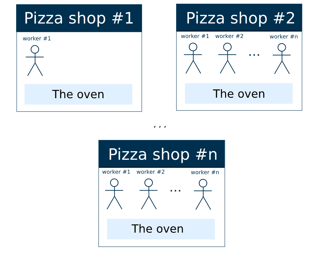 작업자가 수행하는 임무들은 피자 가게 프로세스 내부의 쓰레드들입니다.
