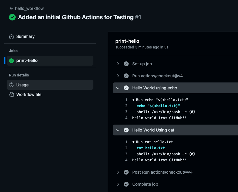 만약 당신이 워크플로우 hello_workflow 의 커밋 이름을 클릭한다면,