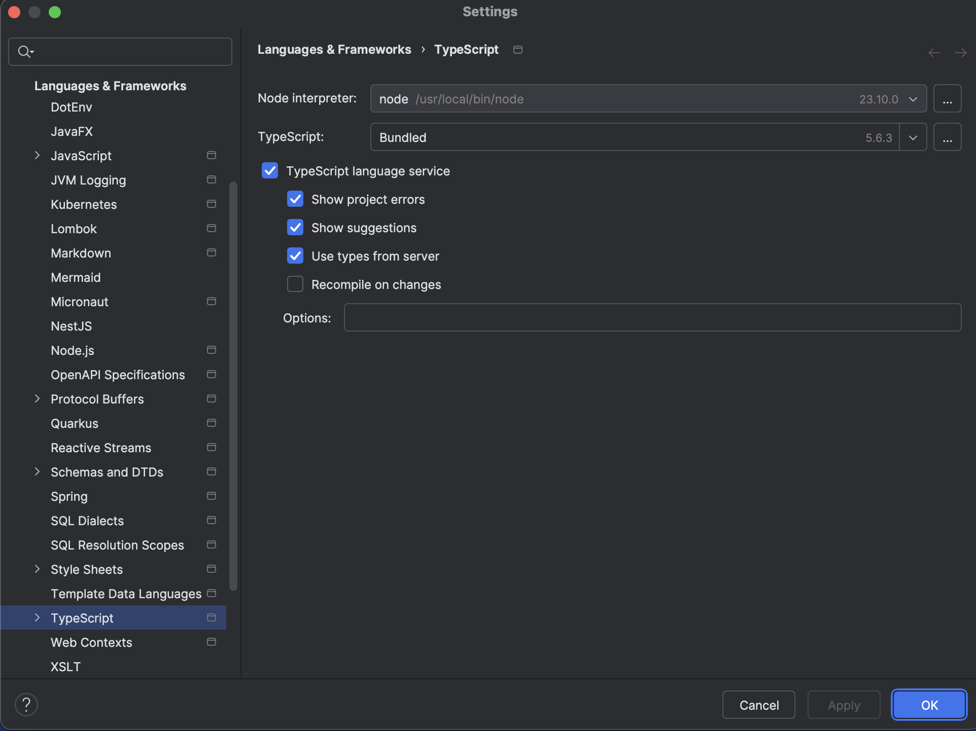따라서, Settings --> Language & Frameworks --> TypeScript --> Bundled (5.6.3)